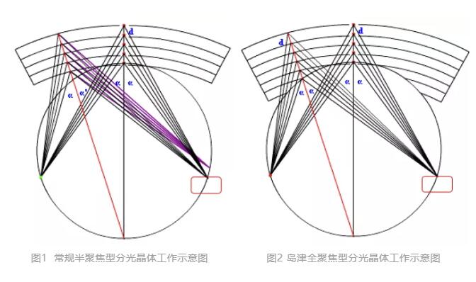 圖1為常規(guī)的半聚焦分光晶體工作示意圖,如果需要高靈敏度時(shí),需要把特征X 射線(xiàn)檢測(cè)器前端的狹縫調(diào)大,但必然會(huì)造成分辨率的變差; 反之,需要高分辨率時(shí),則要把檢測(cè)器狹縫縮窄,但又會(huì)造成靈敏度的下降;顯然在面對(duì)分辨率和靈敏度的兩難抉擇時(shí),半聚焦分光晶體自是顧此失彼、捉襟見(jiàn)肘。而島津全聚焦分光晶體(圖2),則兼顧了靈敏度與分辨率。
