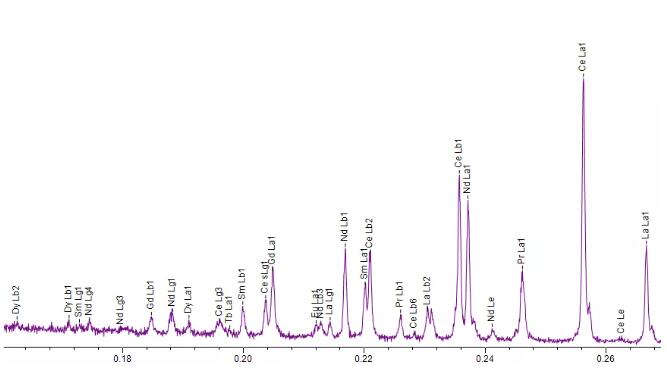 正如共生的稀土資源不易分離,稀土元素特征X射線(xiàn)信號(hào)之間也是重疊嚴(yán)重、彼此干擾。表現(xiàn)在特征X射線(xiàn)的譜圖上,就是密密麻麻的特征譜線(xiàn)彼此緊鄰。如果要把這些譜線(xiàn)區(qū)分開(kāi)來(lái),儀器必須具有良好的分辨率。此外,除主量元素外,稀土礦通常也含有多種低含量的共生稀土元素,這對(duì)測(cè)試儀器的檢測(cè)靈敏度也是極大的考驗(yàn)。